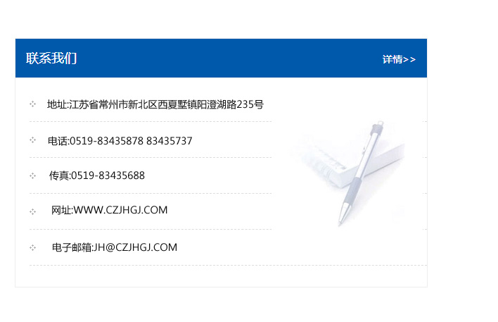 地址:常州市新北區(qū)友邦商務大廈1幢16、17層  電話:0519-85101652  傳真:0519-85112595  郵編:213022  網(wǎng)址:www.cz-jiayue_cn.sxshmjc.com  郵箱:xiajifengaa@163.com